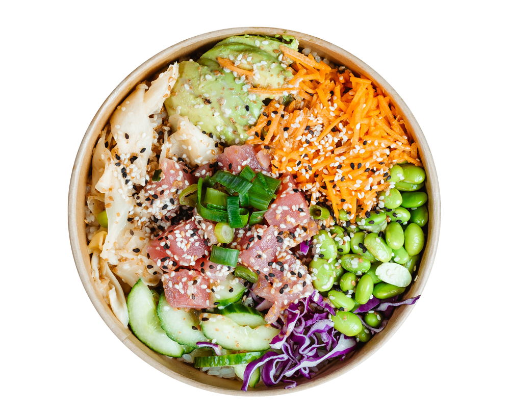 Fresh tuna, rice or noodles, pickled cucumber, spring onions, edamame.